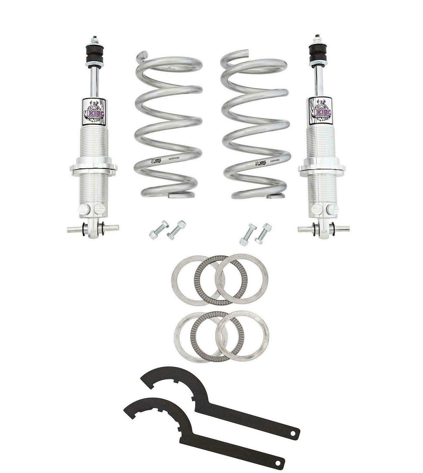 VIKING’s Front Coil Over Kit combines a high-quality hybrid spring with a 19-position double adjustable shock. The upper coil fits the upper spring perch on your vehicle while the lower part of the coil matches the coil over shock bottom. A coil spring compressor is not required, as the adjuster acts as the compressor. The optional Thrust Bearing & Spanner Wrenches allow for easy adjustment of ride height from factory to 1-1/2″ lowering. The shock itself has independent compression & rebound adjusters to allow custom tuning for street, strip, auto-x & road race – all in one shock.